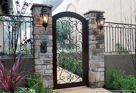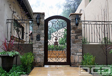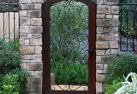 For foot traffic control, privacy and safety, we designed various Mediterranean Style Garden Gates in a designed that was directly derived from the garage door design. Each gate was built on a metalized steel "chassis" with an integrated hand-forged wrought iron scroll design and solid mahogany cladded frame. The extra strength engineering that went into each garden gate ensures that the gates will last a lifetime while increasing the security of the home's grounds. The pool safety gate needed to pass inspection and because of the iron scrolls it wouldn't have passed since a child could climb it and jump over it. Our door design team came up with the perfect solution by adding a safety laminated tempered glass pane to the front part of the gate to avoid this and be able to pass inspection. We work with our clients to ensure that each project inspection will pass with flying colors while maintaining the aesthetic look of luxury!