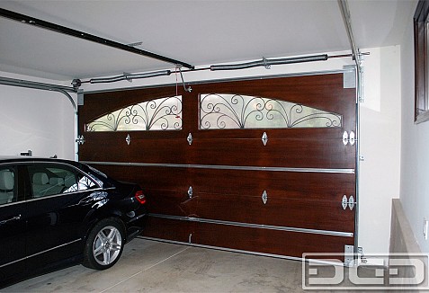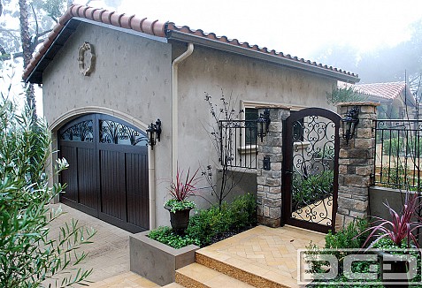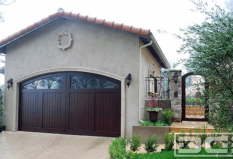 The Custom Wood Garage Door features a beautiful arched top which we matched to perfection following the existing lines of the opening. We handsomely forged window iron scrolls that added class, distinction and safety while complementing the scroll design of the various garden gates. Staining the garage door in a rich dark color created an outstanding contrast between the home's lighter color scheme and landscape. Paired with a whisper-quiet, German engineered Marantec garage door opener makes the use of the door a breeze! The Mediterranean Garage Door added authentic European styling to the home and conveys a warm invitation to the residents each and everyday as they are welcomed to their Mediterranean Estate in architectural style.