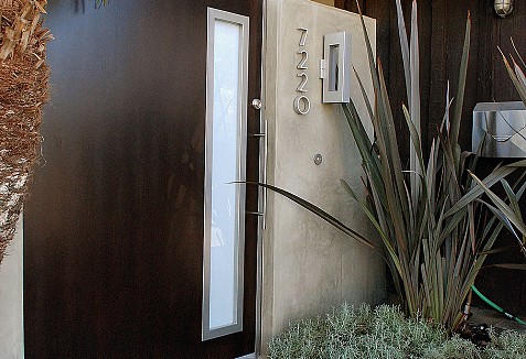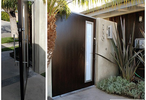 This Mid Century Modern gate was custom designed specifically to flow with this Cliff May Rancho Estate in Long Beach, CA. The eclectic mix of modern design and classic architectural styles from the 50's make a fabulous blend that yield minimalistic, fine-lines that create a stunning curb appeal! Since there is a courtyard prior to entering this Mid Century home, the main entry focus was the design of the gate. We opted for a pivot gate mechanism for this modern style gate to strengthen the beauty of the simple design lines typical of Mid Century architectural styles. The use of composite, faux-stained wood, white laminate glass and stainless steel tubular handle was exclusively used to give the custom pivot gate a flare of modern architectural design while tying in the classical architectural elements already found throughout the home.