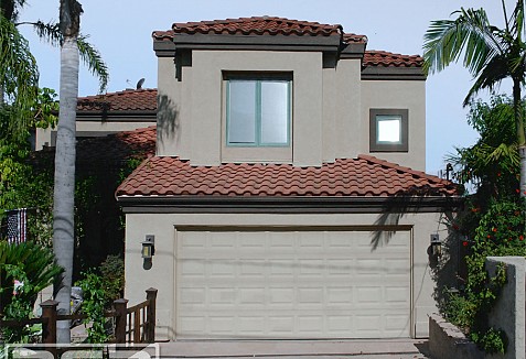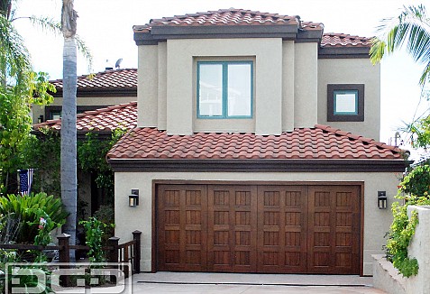 This San Diego Mediterranean style home was lacking that rich architectural essence typical of the Mediterranean style homes. Upgrading the garage door to one of our custom designed architectural garage doors worked wonders for the architecture of this home. This custom garage door was crafted in solid mahogany which was bleached and stained a warm caramel brown to pull in the existing color scheme and architectural elements. Often times we will bleach the red tones out of mahogany wood to achieve a certain stain color that can be interfered with by the natural red tones typical of this wood species. The casing surrounding the new custom garage door was also redone in the same bleached mahogany we used on the wood garage door to "frame" the new door which in turn gave it a clean  finish appearance that further enhanced the home's architectural beauty.