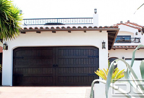 This gorgeous Spanish Colonial home in San Clemente was gorgeously fitted with a custom garage door by Dynamic Garage Door. The custom door features beautiful Spanish accents such as the decorative iron hardware which includes decorative iron hinge straps and ring pulls. The dark stained mahogany beautifully complements the dark wooden eves of the home and picks up on some of the tonalities on the terracotta roof tiles.