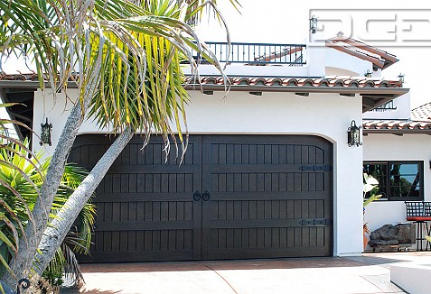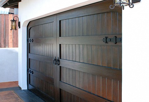 Our Spanish Garage Doors are rivaled second to none because of their unique styling specifically made for each of our client's personal taste and existing home architectural elements. Take for instance, this San Clemente, CA Spanish Colonial home which was beautifully renovated to an authentically charming Spanish architectural style. The garage door features authentic European features such as the handmade iron hardware. Crafted out of solid African Mahogany wood, the custom garage door was masterfully finished in a dark toned stain to complement the existing home's eves and dark iron light fixtures found throughout the premises.