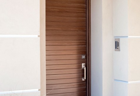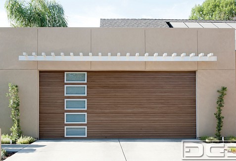 Central Valley, CA - Featuring a modern design entry door in composite wood materials with modern chrome lock set. The modern door design features a horizontal slat design with v-grooves finished in a hand-applied faux stain which simulates real wood grain. The design, though minimalistic, is a beautiful touch to the modern home and complements the garage door designs beautifully. Both, the garage doors and gate, in this project were custom designed and manufactured by Dynamic Garage Door.